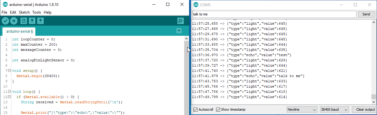 Serial communication is done at a predefined speed which needs to be known on both sides, as both the sender and receiver need to handle the data at the same speed. This speed is called the “baud rate” with a value indicating the number of bits per second (bps). The most used speed is 9600 bps, but you can use lower (1200, 2400, 4800) or higher (19200, 38400, 57600, 115200) speeds, depending on the speed which can be handled reliably by the device.